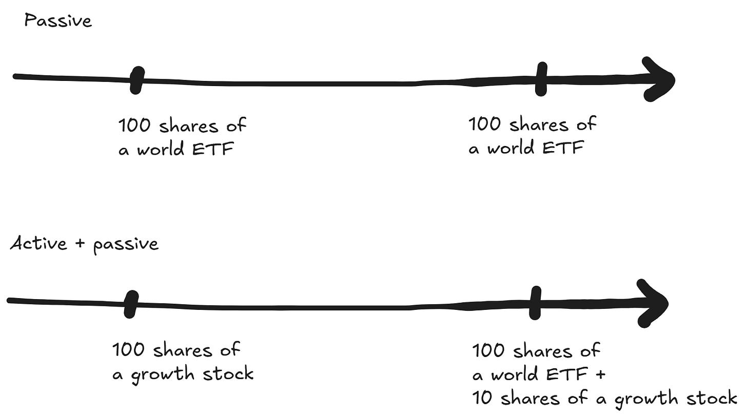 So, if my stock pick turns profitable, I use this profit as fuel for a time machine: the result is exactly the same as if I had bought the passive index and got some additional stock shares for free.