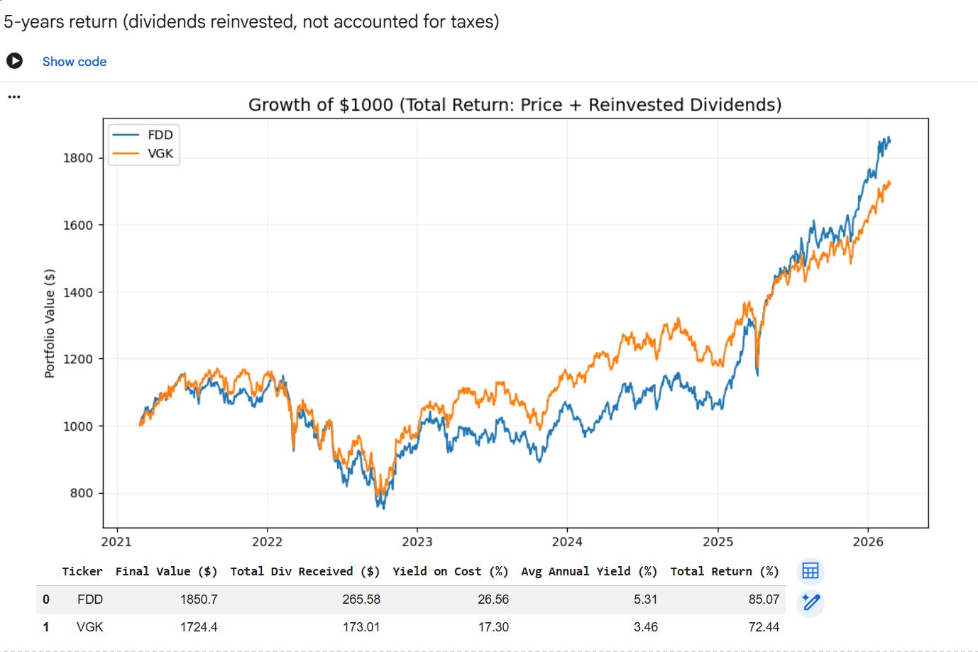 We can’t compare their price performance head-to-head, because a significant portion of their returns are dividends paid every year, unlike accumulating ETFs I mentioned earlier. I was surprised that the sites from the top of Google do not show total returns, just separate prices histories and dividend yield. So I crafted a simple Python script which gets data from Yahoo Finance and calculates the period performance: