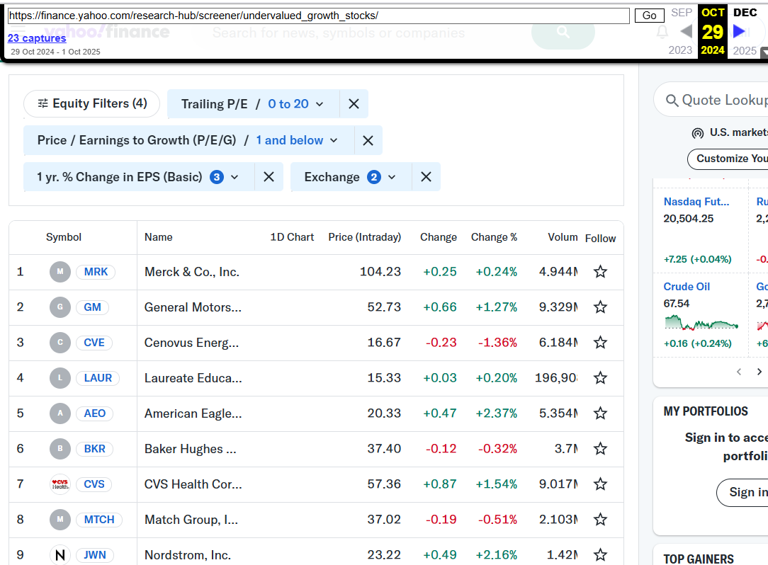 A lazy investor visits the Yahoo Finance Undervalued Growth Stocks page.